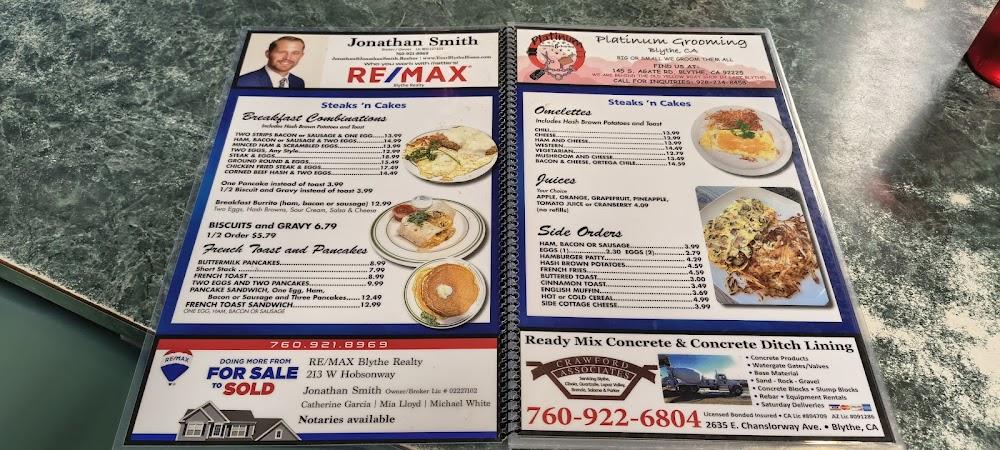 Welcome to Steaks n Cakes, a charming diner located at 1871 E Hobsonway, Blythe, CA. Our family-friendly restaurant is the perfect spot for breakfast, lunch, or dinner, featuring delicious local specialties alongside exceptional coffee and mouth-watering desserts. Enjoy a relaxed ambiance and quick service whether you're dining solo or with a group. With wheelchair accessibility and convenient takeout options, we cater to all. Indulge in great food, refreshing drinks, and a comfortable setting. Visit us today for a delightful culinary experience that keeps our guests coming back!