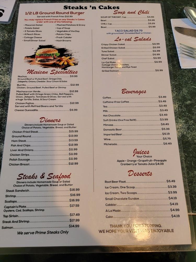 The diverse menu features traditional American eats and local specialties. Breakfast shines with omelettes, pancakes, and hearty combinations like steak & eggs. For lunch, sandwiches and burgers steal the show, complemented by unique Mexican options like nachos and fajitas.